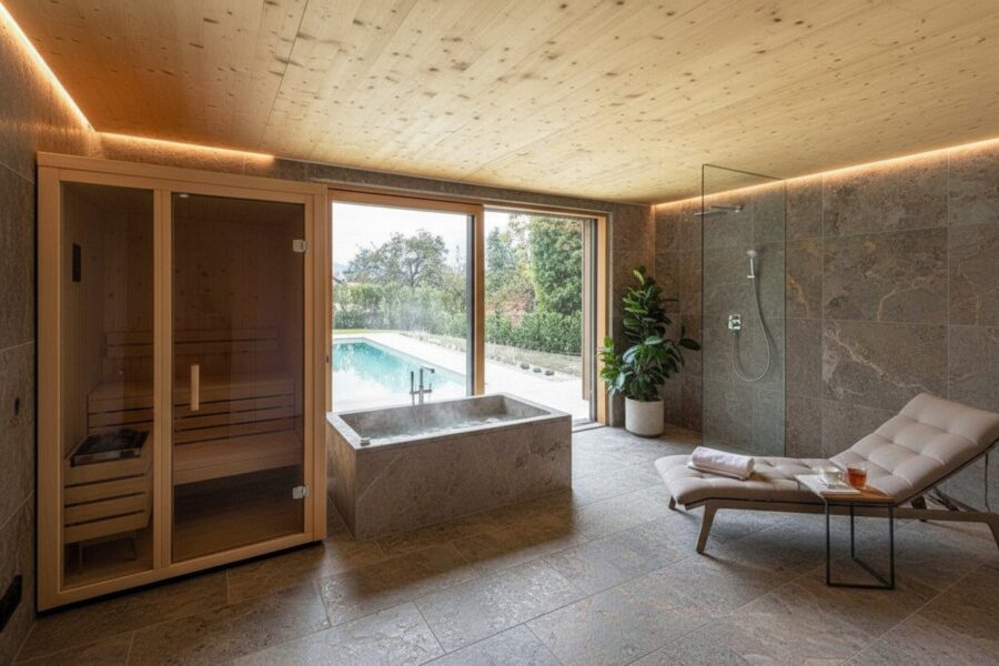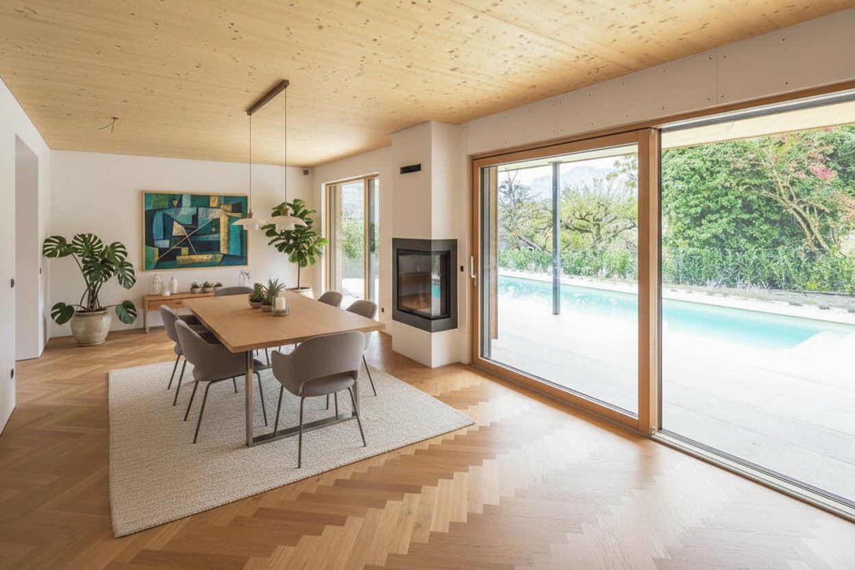 Ein beheizter und überdachter Swimmingpool sorgt ganzjährig für Urlaubsfeeling im eigenen Zuhause.