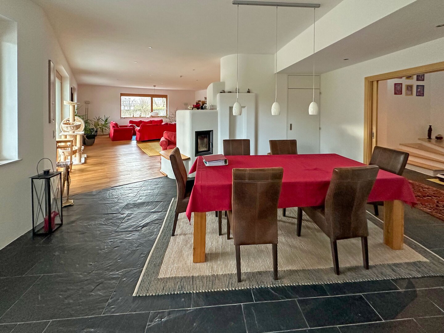 Hochwertige Natursteinböden und edles Vollholzparkett verleihen dem Haus einen eleganten und zeitlosen Charakter, großzügige Raumhöhen schaffen ein luftiges und freies Wohngefühl. Der stilvolle Kamin im Wohnzimmer spendet nicht nur wohlige Wärme, sondern ist auch ein optisches Highlight.